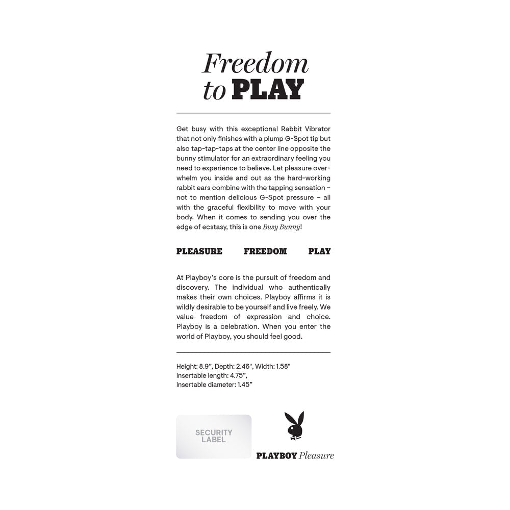 Get busy with this exceptional Rabbit Vibrator that not only finishes with a plump G-Spot tip but also tap-tap-taps at the center line opposite the bunny stimulator for an extraordinary feeling you need to experience to believe. Let pleasure overwhelm you inside and out as the hard-working rabbit ears combine with the tapping sensation β not to mention delicious G-Spot pressure β all with the graceful flexibility to move with your body. When it comes to sending you over the edge of ecstasy, this is one Busy Bunny! Play with me (key feature): G-Spot Tapping Rabbit Vibrator Vibration and Tapping: 10 speeds and rhythms Material: Body-safe Silicone and ABS, Phthalate and Latex free Waterproof: Yes Warranty: Five years Rechargeable: USB cable included Height: 8.9", Depth: 2.46", Width: 1.58" Insertable length: 4.75", insertable diameter: 1.45"