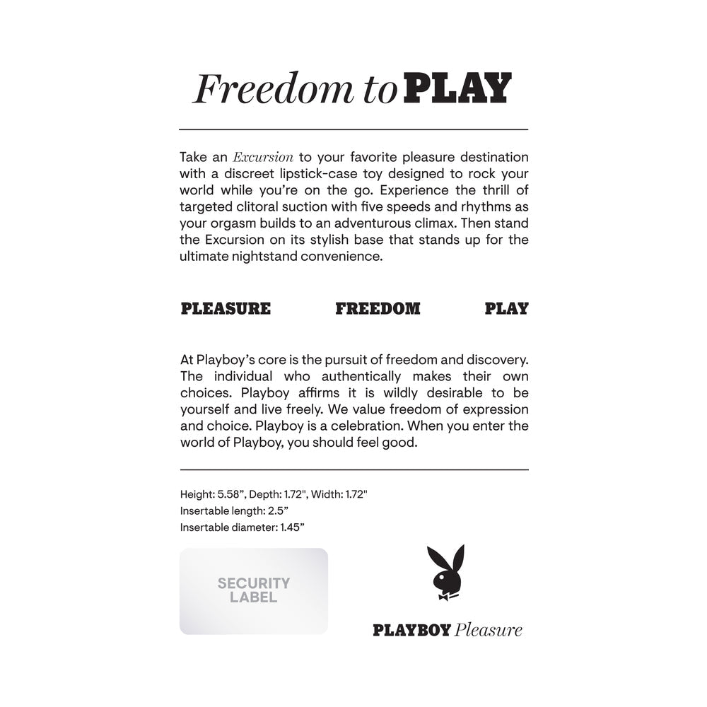 Take an Excursion to your favorite pleasure destination with a discreet lipstick-case toy designed to rock your world while youft.re on the go. Experience the thrill of targeted clitoral suction with five speeds and rhythms as your orgasm builds to an adventurous climax. Then stand the Excursion on its stylish base that stands up for the ultimate nightstand convenience. Play with me (key features): Clitoral suction Vibration: 5 suction speeds and rhythms Material: Body-safe Silicone, Phthalate and Latex free Splashproof: Yes Warranty: Five yearss Rechargeable: USB cable included Size Specs Height: 5.58in., Depth: 1.72in., Width: 1.72in., Diameter: 1.45in. Insertable length: 2.5in.
