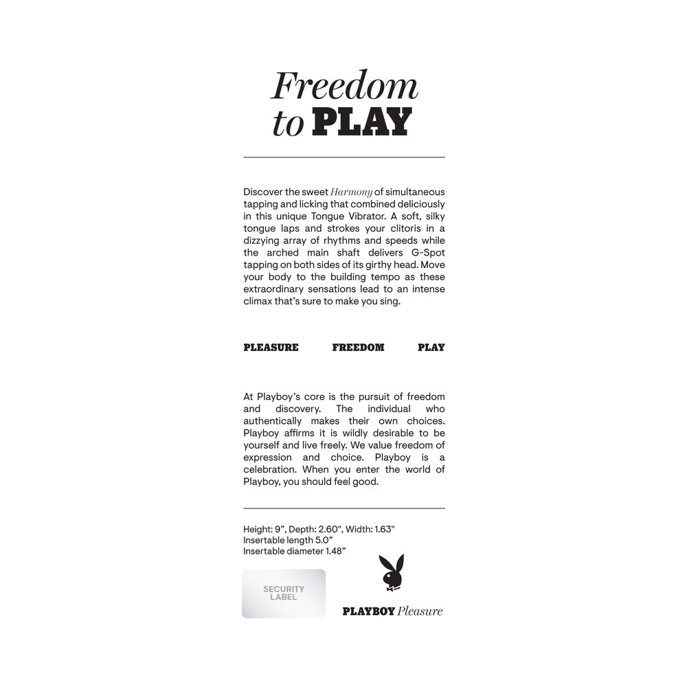 Discover the sweet Harmony of simultaneous tapping and licking that combined deliciously in this unique Tongue Vibrator. A soft, silky tongue laps and strokes your clitoris in a dizzying array of rhythms and speeds while the arched main shaft delivers G-Spot tapping on both sides of its girthy head. Move your body to the building tempo as these extraordinary sensations lead to an intense climax that''s sure to make you sing. Play with me (key feature): Clitoral Tongue-Licking, G-Spot Double Tapping Vibration: 10 tapping and 10 flicking speeds and rhythms, motors controlled separately Material: Body-safe Silicone, ABS, Phthalate and Latex free Waterproof: Yes Warranty: Five years Rechargeable: USB magnetic cable included Size Specs Height: 9in., Depth: 2.60in., Width: 1.63in. Insertable length 5.0in., Insertable diameter 1.48in.