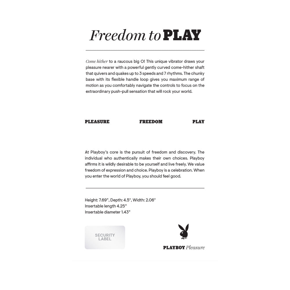 Come hither to a raucous big O! This unique vibrator draws your pleasure nearer with a powerful gently curved come-hither shaft that quivers and quakes up to 3 speeds and 7 rhythms. The chunky base with its flexible handle loop gives you maximum range of motion as you comfortable navigate the controls to focus on the extraordinary push-pull sensation that will rock your world. Vibration: 3 speeds and 7 rhythms Material: Body-safe silicone and ABS, Phthalate and Latex-free Waterproof: Yes Warranty: Five years Rechargeable: USB cable included Size SpecsToy: H: 7.69in., D: 4.5in., W: 2.06in., Insertable Length: 4.25in., Insertable Diameter: 1.43in.