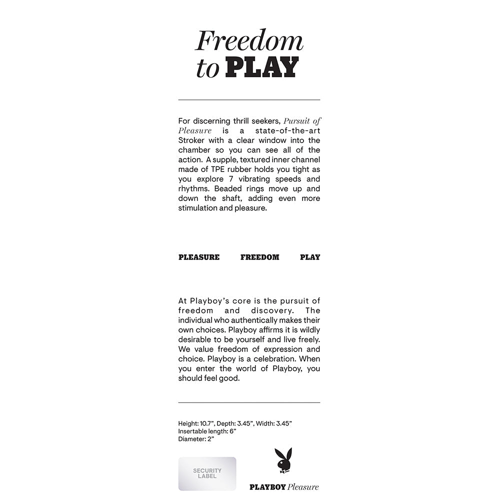 For discerning thrill seekers, Pursuit of Pleasure is a state-of-the-art Stroker with a clear window into the chamber so you can see all of the action. A supple, textured inner channel made of TPE rubber holds you tight as you explore 7 vibrating speeds and rhythms. Beaded rings move up and down the shaft, adding even more stimulation and pleasure. Vibrating beaded Stroker with voyeur chamber 7 vibrating speeds & rhythms 7 ring speeds & rhythms TPE rubber & ABS plastic Phthalate & latex free Splashproof Rechargeable, USB cable included 5 year Warranty Dimensions: Height: 10.7in., Depth: 3.45in., Width: 3.45in.. Channel Depth: 6in.