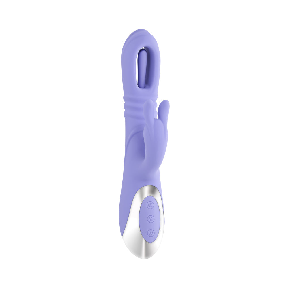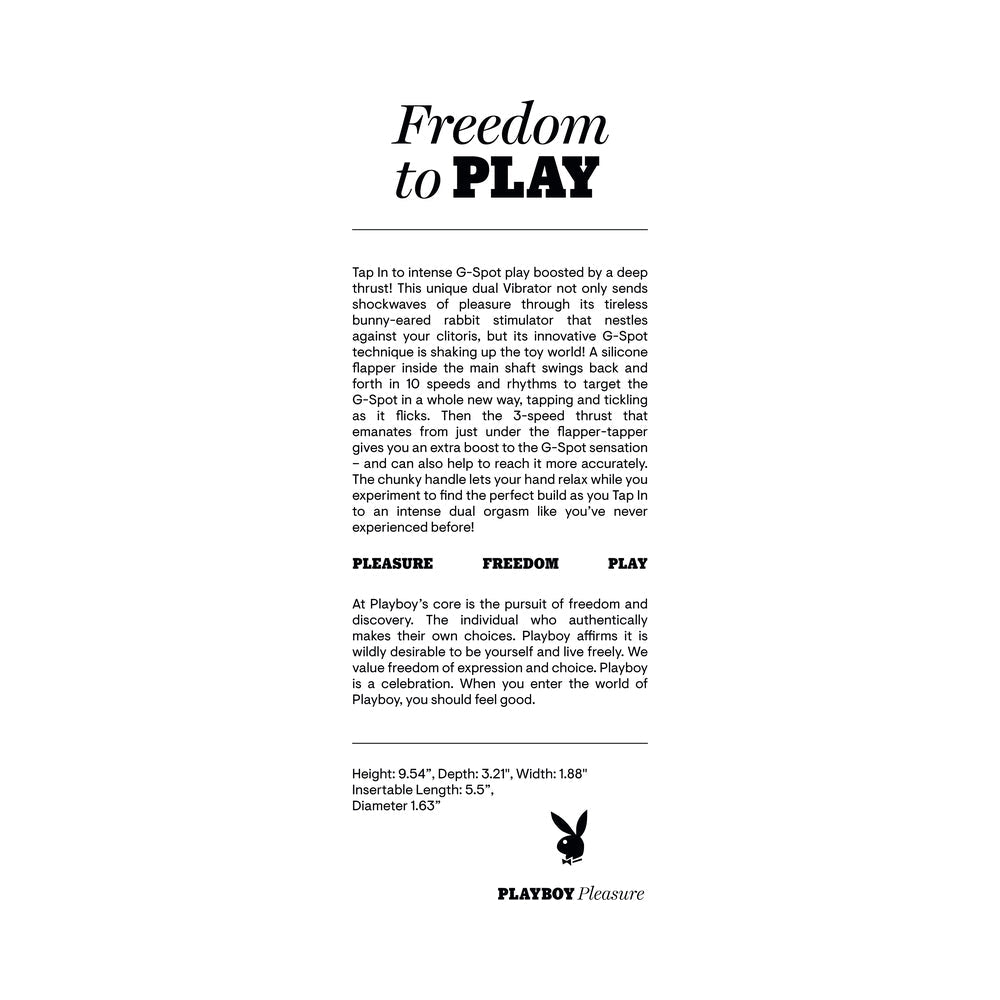 Tap In to intense G-spot play boosted by a deep thrust! This unique dual Vibrator not only sends shockwaves of pleasure through its tireless bunny-eared rabbit stimulator that nestles against your clitoris, but its innovative G-spot technique is shaking up the toy world! A silicone flapper inside the main shaft swings back and forth in 10 speeds and rhythms to target the G-spot in a whole new way, tapping and tickling as it flicks. Then the 3-speed thrust that emanates from just under the flapper-tapper gives you an extra boost tot he G-spot sensation β and can also help to reach it more accurately. The chunky handle lets your hand relax while you experiment to find the perfect build as you Tap In to an intense dual orgasm like you''ve never experienced before! Play with me (key feature): Dual Vibrator with Flapper & Thrusting in Main Shaft Vibration: 10 speeds & rhythms in rabbit & tapping in main shaft, 8 thrusting speeds Material: Body-safe Phthalate & Latex-free Silicone & ABS Waterproof: Yes Warranty: Five years Rechargeable: USB cable included Height: 9.54" Depth: 3.21" Width: 1.88" Insertable length: 5.5" Insertable diameter: 1.63"