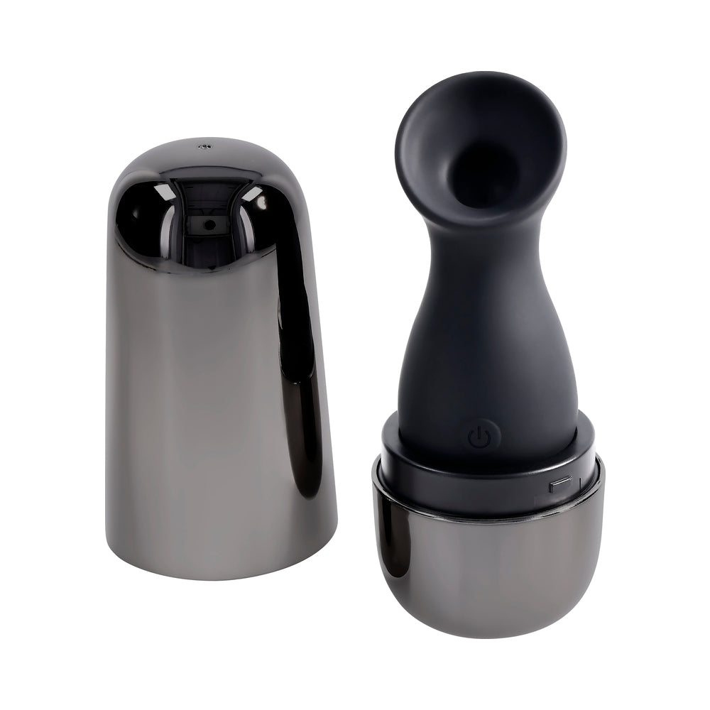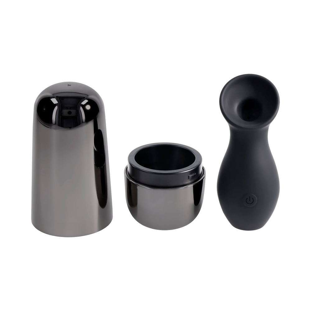 Join the Jet Set with this orgasm-inducing clitoral suction toy that pops into a chic metallic black travel case where it charges via USB. Experience the intense pleasure of targeted suction atop a flexible tip that moves with your body while you enjoy the discreet size that lets you bring it along wherever your adventures might take you. Play with me (key feature): Clitoral suction, self-charging case Vibration: 5 speeds and rhythms Material: Body-safe silicone and ABS, Phthalate and Latex-free Splashproof: Yes Warranty: Five years Rechargeable: USB cable included Size Specs Toy: H: 4.04in., D: 1.62in., W: 1.62in. With case: H: 5.18in., D: 2.14in., W: 2.14in.