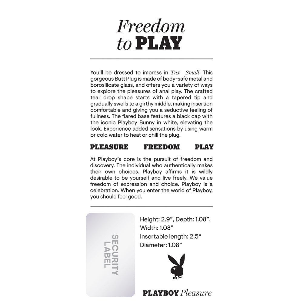 Freedom to Play:Youft.ll be dressed to impress in Tux - Small. This gorgeous Butt Plug is made of body-safe aluminum alloy, and offers you a variety of ways to explore the pleasures of anal play. The crafted tear drop shape starts with a tapered tip and gradually swells to a girthy middle, making insertion comfortable and giving you a seductive feeling of fullness. The flared base features a black cap with the iconic Playboy Bunny in white, elevating the look. Experience added sensations by using warm or cold water to heat or chill the plug. Small metal Butt Plug designed for safe anal exploration featuring iconic Rabbit Head Design Body-safe Aluminum Alloy & ABS Plastic Phthalate & latex free Waterproof & submersible 5 year Warranty Dimensions Length: 2.9in. Depth: 2.5in. Width: 1.45in. Small - Length: 2.9in. Depth: 1.08in. Width: 1.08in.