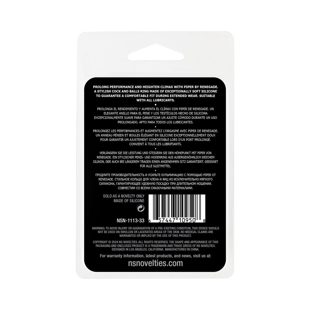 Prolong performance and heighten climax with Piper by Renegade. A stylish cock and balls ring made of exceptionally soft silicone to guarantee a comfortable fit during extended wear. Suitable with all lubricants including silicone.