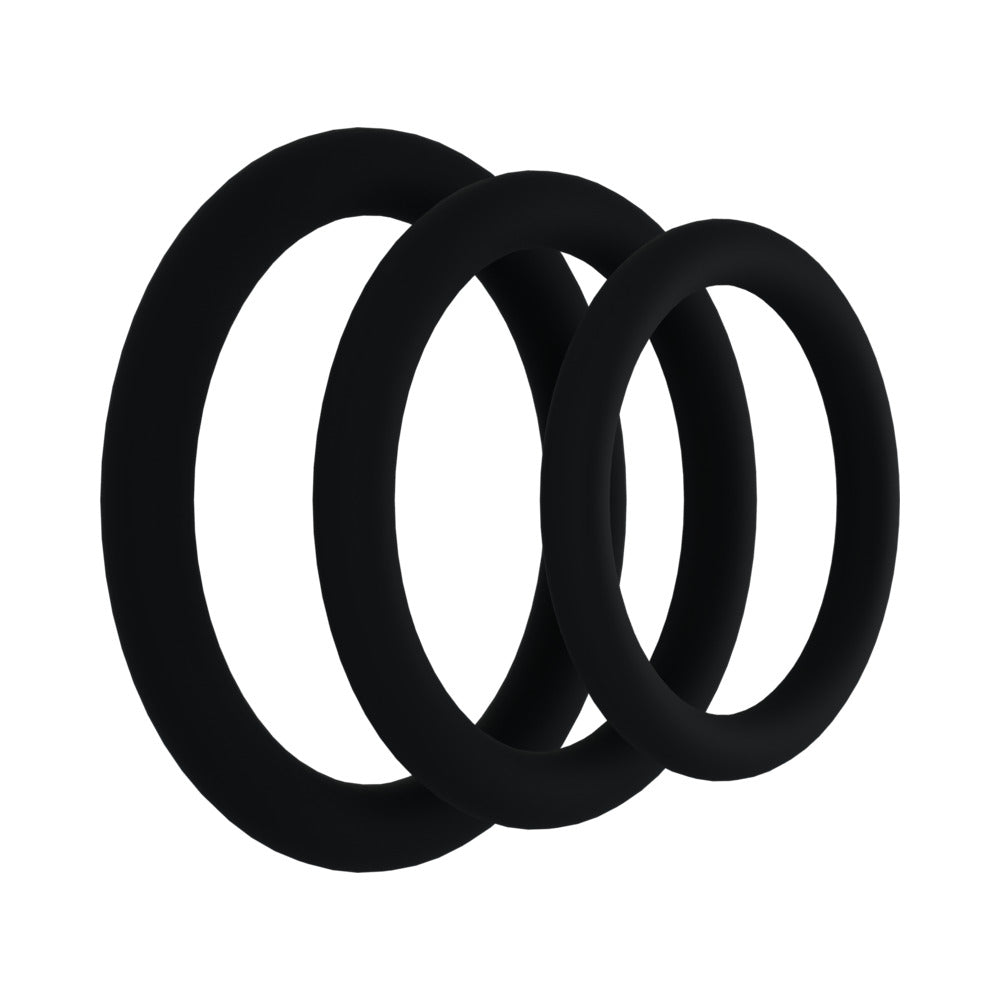 Three simple gasket cock rings made of silicone, varying sizes (0.75, 1, 1.25 in.).