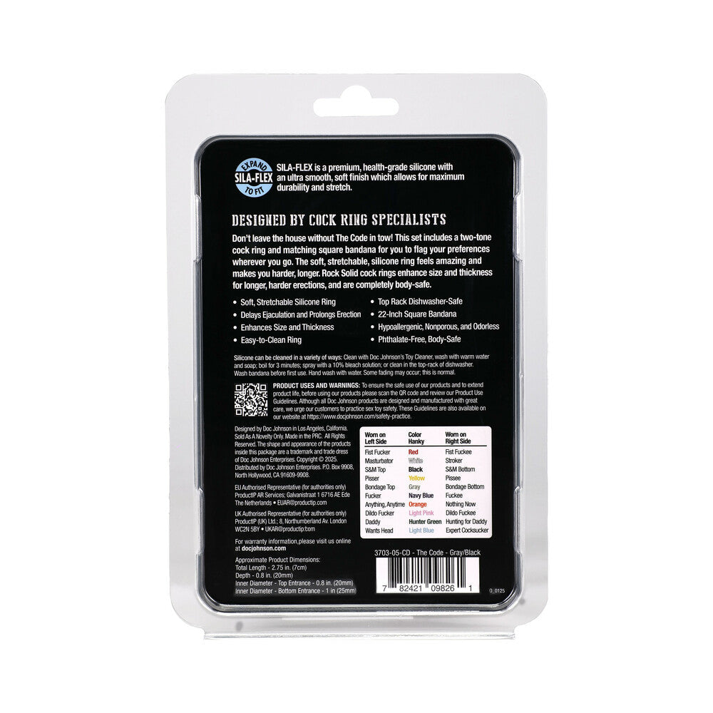 Don''t leave the house without The Code in tow! This set includes a two-tone cock ring and matching square bandana for you to flag your preferences wherever you go. The soft, stretchable, silicone ring feels amazing and makes you harder, longer. Rock Solid cock rings enhance size and thickness for longer, harder erections, and are completely body-safe. Soft, Stretchable Silicone Ring Delays Ejaculation and Prolongs Erection Enhances Size and Thickness Easy-to-Clean Ring; Top Rack Dishwasher-Safe 22-Inch Square Bandana Hypoallergenic, Nonporous, and Odorless Phthalate-Free, Body-Safe CockringTotal Length: 2.75 in. (7cm)Width/Diameter: 2 in. (5.1cm)Depth: 0.8 in. (20mm)Bandana (Hanky)Total Length: 22 in. (55.9 cm)Width/Diameter: 22 in. (55.9 cm)