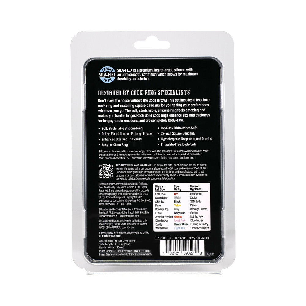 Don''t leave the house without The Code in tow! This set includes a two-tone cock ring and matching square bandana for you to flag your preferences wherever you go. The soft, stretchable, silicone ring feels amazing and makes you harder, longer. Rock Solid cock rings enhance size and thickness for longer, harder erections, and are completely body-safe. Soft, Stretchable Silicone Ring Delays Ejaculation and Prolongs Erection Enhances Size and Thickness Easy-to-Clean Ring; Top Rack Dishwasher-Safe 22-Inch Square Bandana Hypoallergenic, Nonporous, and Odorless Phthalate-Free, Body-Safe CockringTotal Length: 2.75 in. (7cm)Width/Diameter: 2 in. (5.1cm)Depth: 0.8 in. (20mm)Bandana (Hanky)Total Length: 22 in. (55.9 cm)Width/Diameter: 22 in. (55.9 cm)