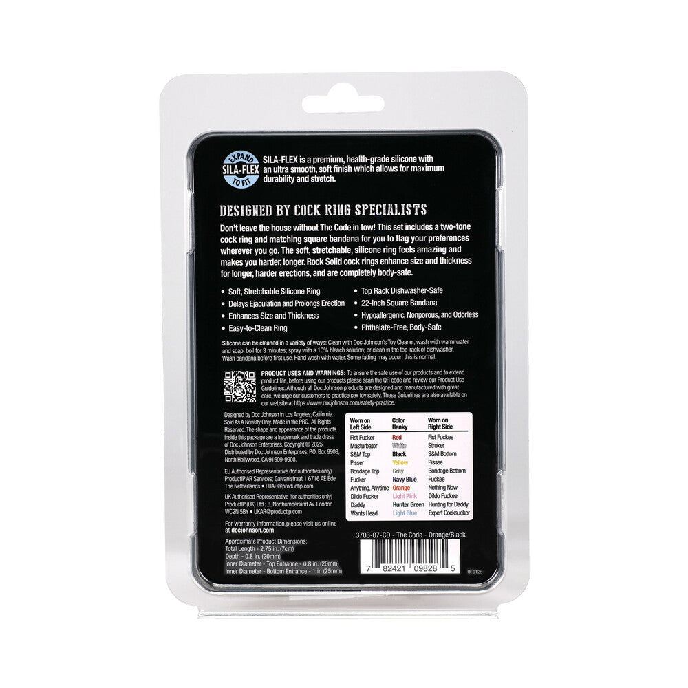 Don''t leave the house without The Code in tow! This set includes a two-tone cock ring and matching square bandana for you to flag your preferences wherever you go. The soft, stretchable, silicone ring feels amazing and makes you harder, longer. Rock Solid cock rings enhance size and thickness for longer, harder erections, and are completely body-safe. Soft, Stretchable Silicone Ring Delays Ejaculation and Prolongs Erection Enhances Size and Thickness Easy-to-Clean Ring; Top Rack Dishwasher-Safe 22-Inch Square Bandana Hypoallergenic, Nonporous, and Odorless Phthalate-Free, Body-Safe CockringTotal Length: 2.75 in. (7cm)Width/Diameter: 2 in. (5.1cm)Depth: 0.8 in. (20mm)Bandana (Hanky)Total Length: 22 in. (55.9 cm)Width/Diameter: 22 in. (55.9 cm)