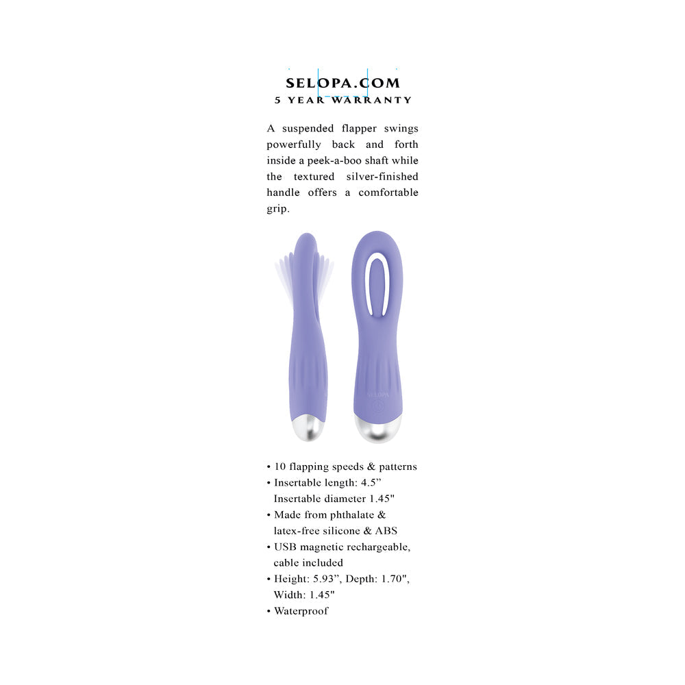 A suspended flapper swings powerfully back and forth inside a peek-a-boo shaft while the textured silver-finished handle offers a comfortable grip. 10 flapping speeds and patterns Height: 5.93", Width: 1.45", Depth: 1.70" Insertable length: 4.5", Insertable Diameter: 1.45" Made from phthalate and latex free silicone and ABS Waterproof USB magnetic rechargeable, cable included