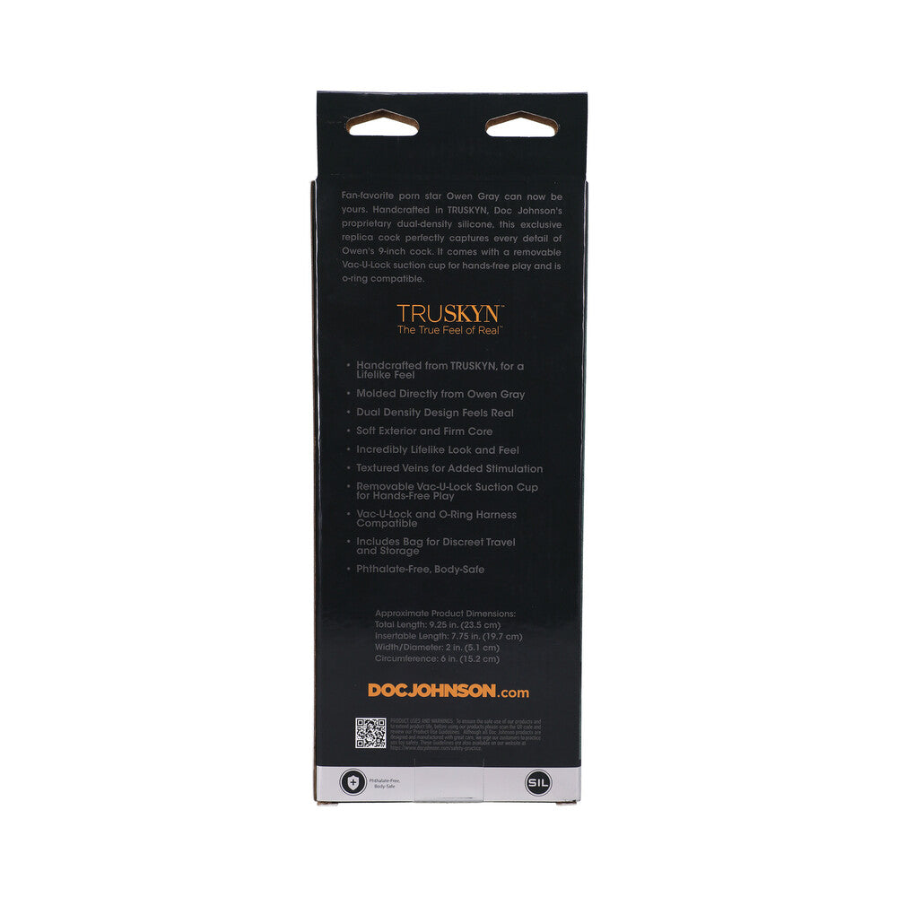 Fan-favorite porn star Owen Gray can now be yours. Handcrafted in TRUSKYN, Doc Johnson''s proprietary dual-density silicone, this exclusive replica cock perfectly captures every detail of Owen''s 9-inch cock. It comes with a removable Vac-U-Lock suction cup for hands-free play and is o-ring compatible. Handcrafted from TRUSKYN, for a Lifelike Feel Molded Directly from Owen Gray Dual Density Design Feels Real Soft Exterior and Firm Core Incredibly Lifelike Look and Feel Textured Veins for Added Stimulation Removable Vac-U-Lock Suction Cup for Hands-Free Play Vac-U-Lock and O-Ring Harness Compatible Includes Bag for Discreet Travel and Storage Phthalate-Free, Body-Safe Dimensions Total Length: 9.25 in. (23.5 cm) Insertable Length: 7.75 in. (19.7 cm) Width/Diameter: 2 in. (5.1 cm) Circumference: 6 in. (15.2 cm) Packaged Weight: 1.72 lbs. (0.78 kg) Packaged Height: 12.7 in. (32.26 cm) Packaged Width: 4.8 in. (12.19 cm) Packaged Depth: 3.5 in. (8.89 cm)