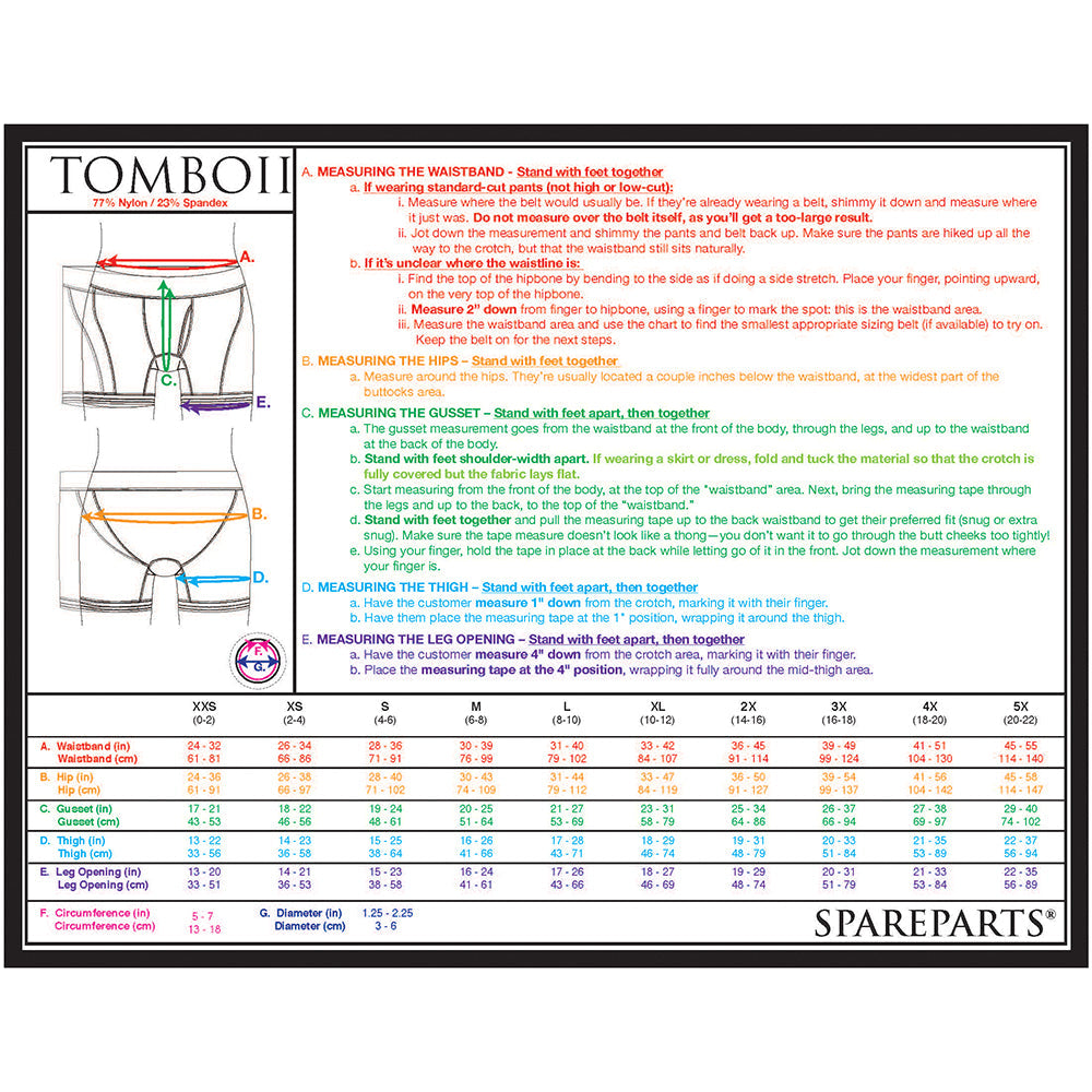Bold attitude with an athletic cut, Tomboi and Tomboii harness briefs deliver a smooth shot of sex appeal and cut right to the chase: letft.s do this. Both versions slide on and off smoothly, without any chafing buckles, dangling straps, pinched skin, or other baggage to get in the way. To say they are thoughtfully designed is an understatement. Available in 2 fabric choices: nylon and rayon.Tomboii includes: 3 pockets for bullets 2 holes for varied angles or double penetration Internal packing strap for pack and play Condom pouch 77% Nylon, 23% Spandex Waistband 41 - 51in. Hip 41 - 56in. Gusset 27 - 38in. Thigh 21 - 35in. Leg Opening 21 - 33in. O-ring circumference 5 - 7in. O-ring diameter 1.25 - 2.25in. Restricted from 3rd party website selling.