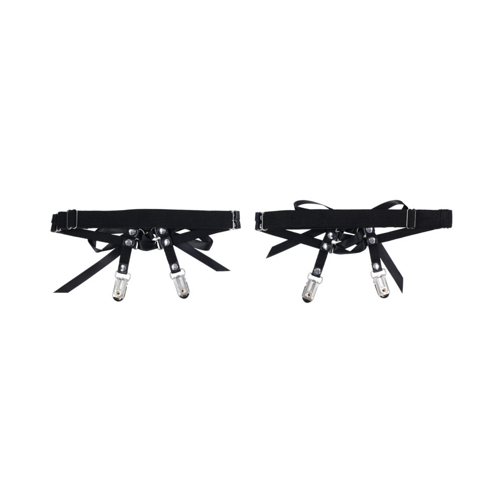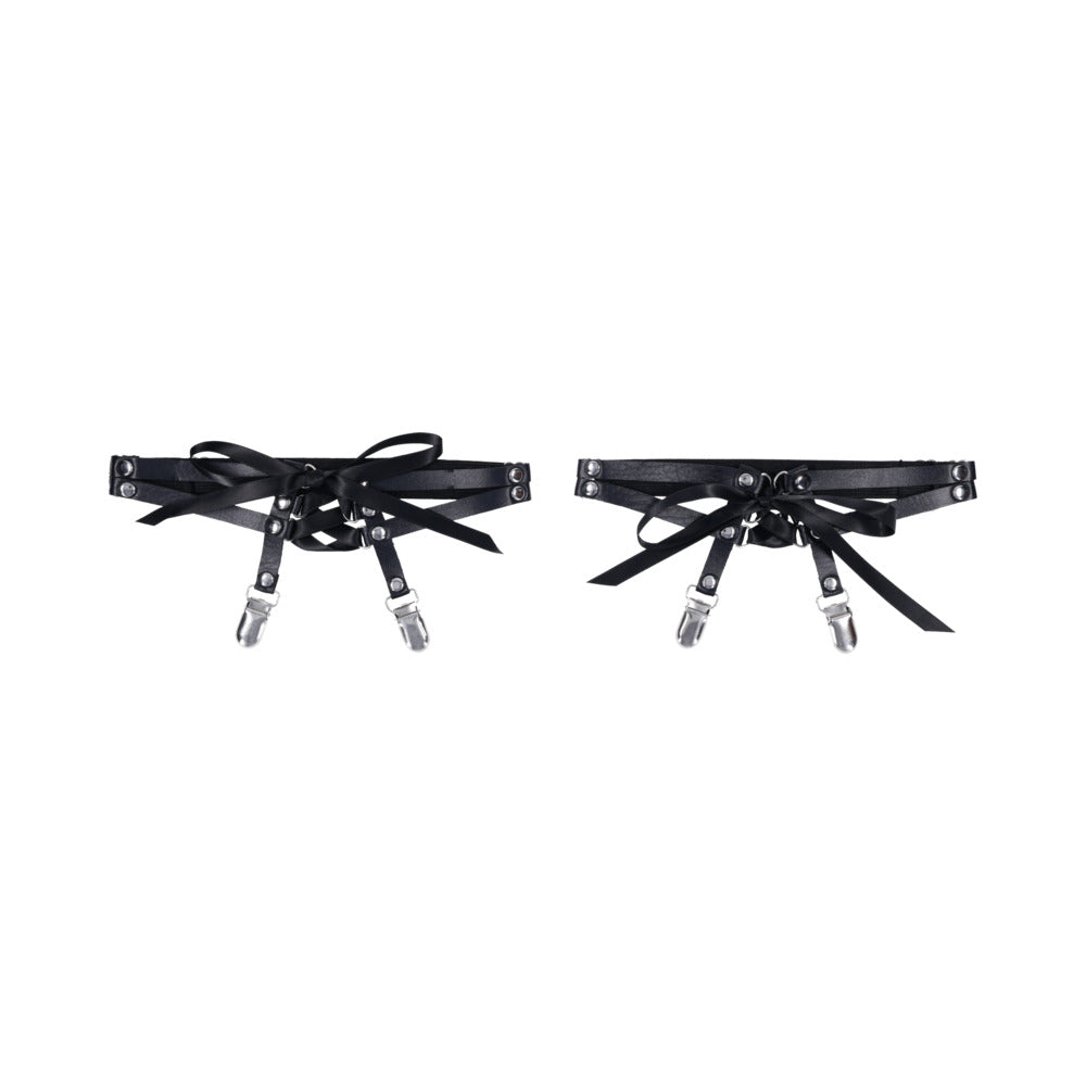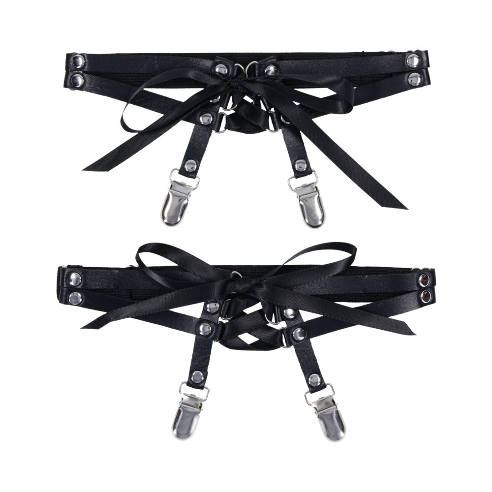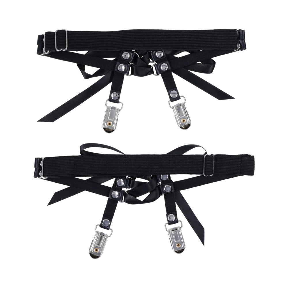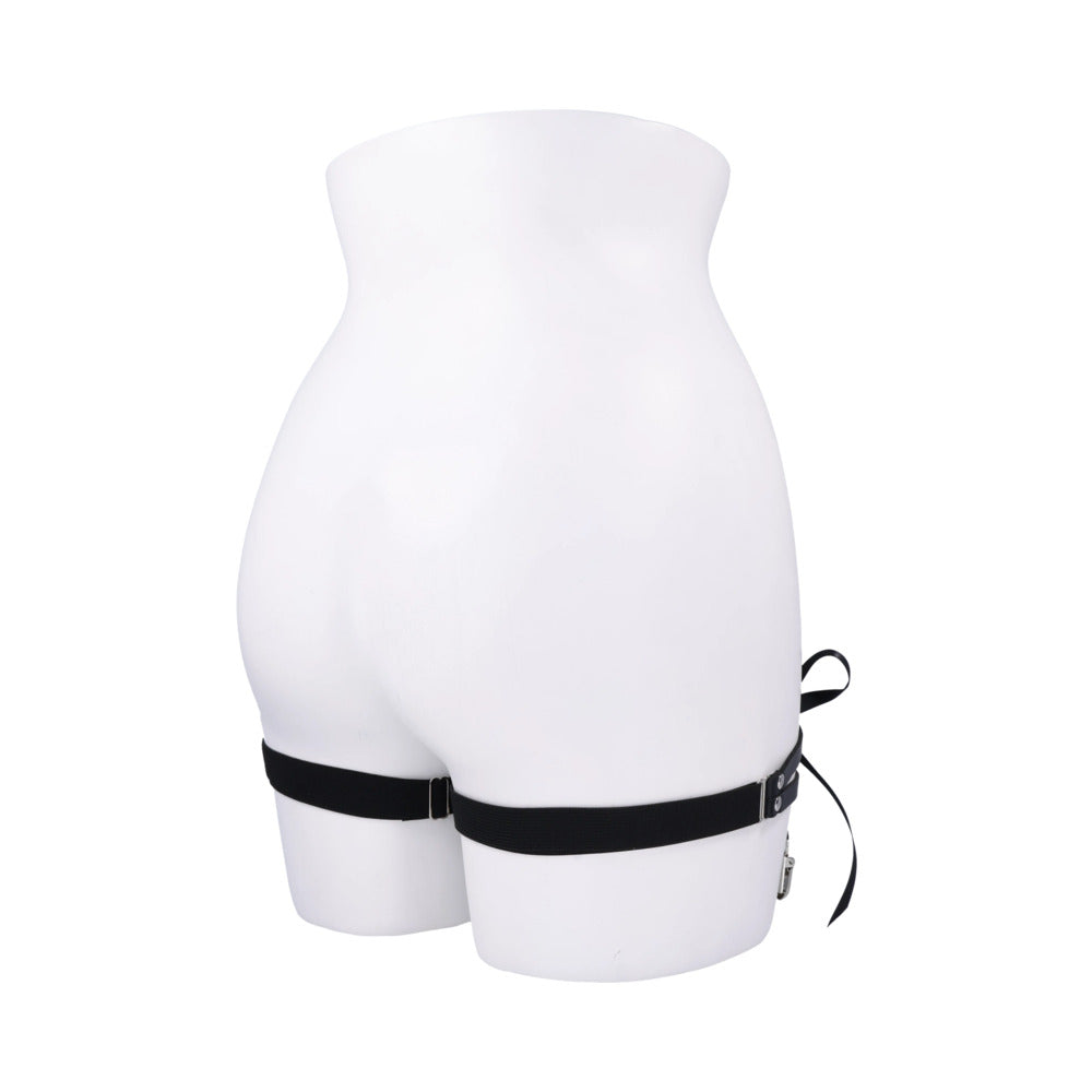 Turn heads and capture hearts with these flirtatiously elegant garters, featuring a sultry lace-up corset design. Black satin ribbon weaves through the faux leather panels, offering an adjustable fit that contours your thighs with seductive precision. A secure clip keeps your thigh-high stockings perfectly in place, while the fusion of bold structure and soft satin strikes the perfect balance between edgy and romantic. Designed to make a statement, the Laced Up Garters empower you to embrace your daring side and indulge in moments of sensual confidence. Fits thighs 18" - 26" (45.7cm - 66cm) Corset design hugs the thigh adding sex appeal and extra adjustability Built-in clips to secure stocking placement Materials: 50% Polyester, 30% Polyurethane, 20% Iron Alloy