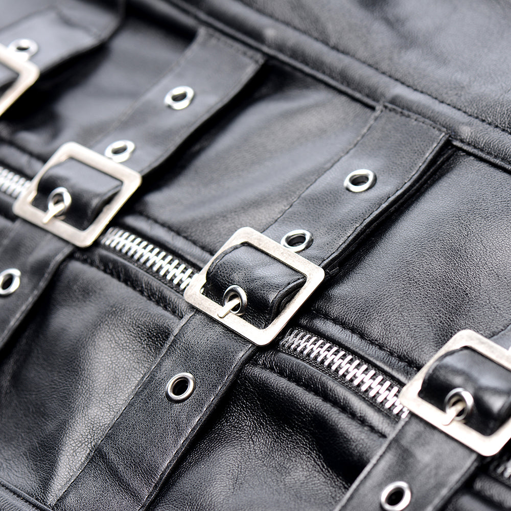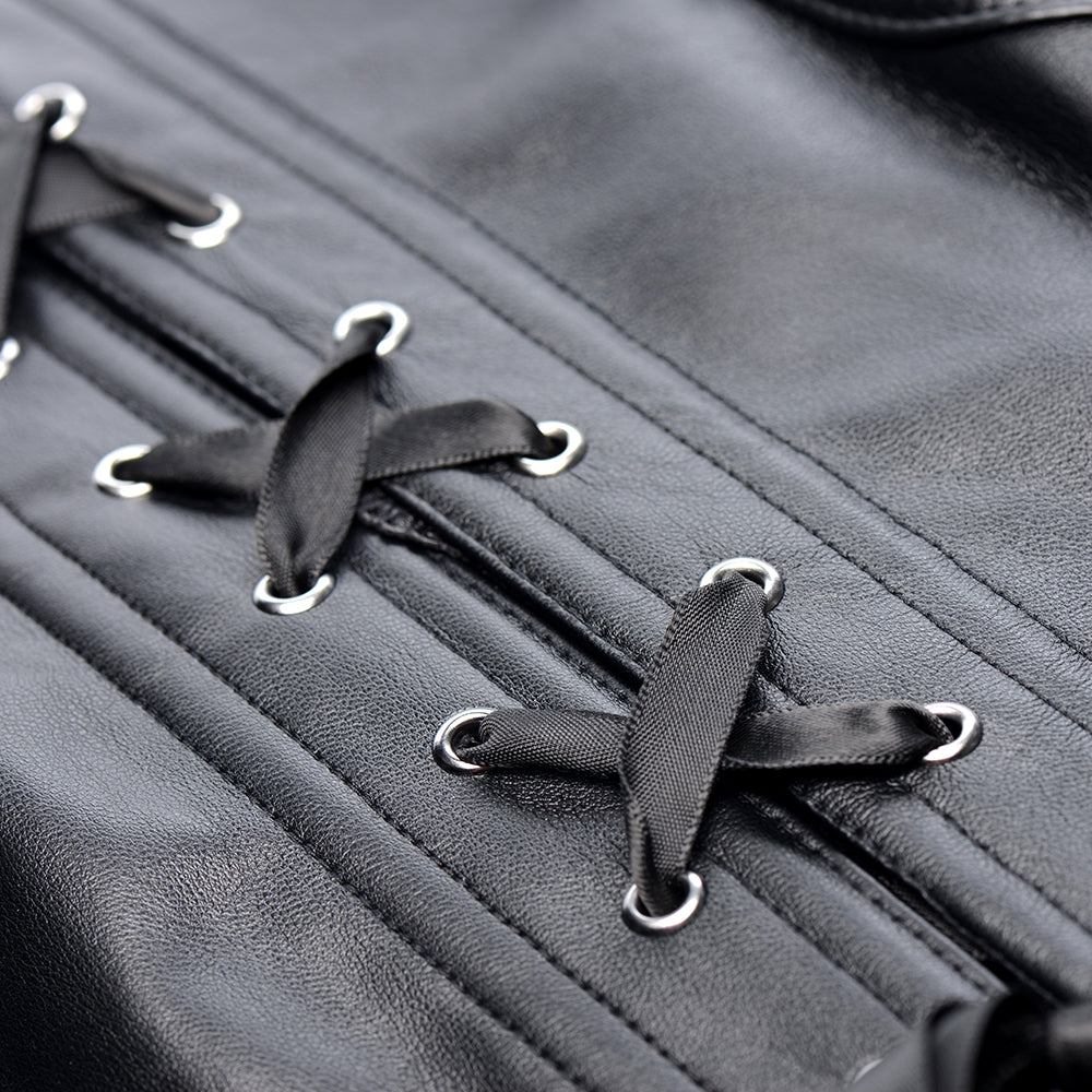 Adopt the domineering aesthetic of a leather mistress with this Lace Up Corset Vest and Thong! Crafted to provide a satisfying hug on your body without discomfort while also displaying a striking silhouette to portray an authoritative persona to fill you with confidence. Lace up, accentuate your curves, and show off your dark side!The soft inner lining is gentle on your skin, while the flexible boning gives this corset structure and stability during wear. Adjust and customize the fit of this Corset with the lacing found in the back and the leather straps and buckles in the front. Matching G-String included, one size fits most. The PU Leather and nickel-free metal hardware is body safe and lightweight so you can move around with ease and enjoy your scene to its fullest. Dominate and tease with a corset fit for all kinds of Dominant personalities! Measurements: Chest 37.5 - 39.5 inches; waist 29.5 - 31.5 inches; panty one size fits most Materials: PU Leather, Nickel Free Metal