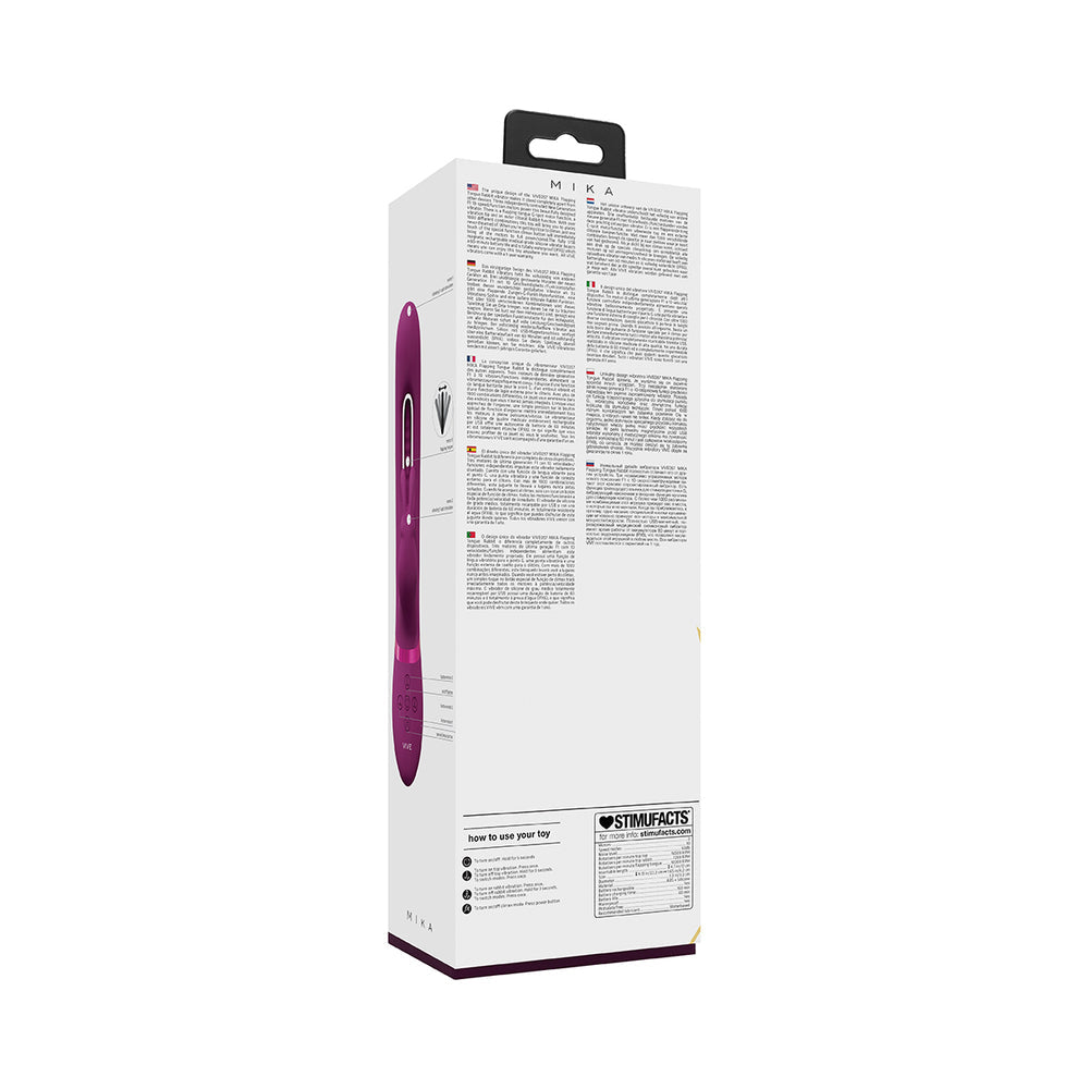 The unique design of the VIVE MIKA Flapping Tongue Rabbit vibrator makes it stand completely apart from other devices. Three independently controlled New Generation F1 10-speed/function motors power this beautifully designed vibrator. There is a flapping tongue G-spot motor function, a vibration tip and an outer clitoral Rabbit function. With over 1000 different combinations this toy will bring you to places never dreamed of. When youft.re getting close to climax, just one touch of the special function climax button will immediately bring all the motors to full power/speed.The fully USB magnetic rechargeable medical-grade silicone vibrator boasts a 60-minute battery life and is totally waterproof (IPX6) which means you can enjoy this toy anywhere you want. All VIVE vibrators come with a 1-year warranty. Dimensions package: 4.33in. x 3.03in. x 13.19in. Weight package: 20.81 oz Product dimensions: 9.13in. x 1.65in. x 2.64in. Product diameter: 1.18in. Insertable length: 4.72in. Quantity motors: 3 Rotations per minute: 7500 RPM Rotations vibration tip: 10000 RPM Speed modes: 10 Multi speed: Yes Noise level: 60 dB Rechargeable: Yes Rechargeable time: 150 min Recharged battery lifetime: 60 min Waterproof: Yes Splashproof: Yes Phthalate free: Yes Materials: Silicone, ABS