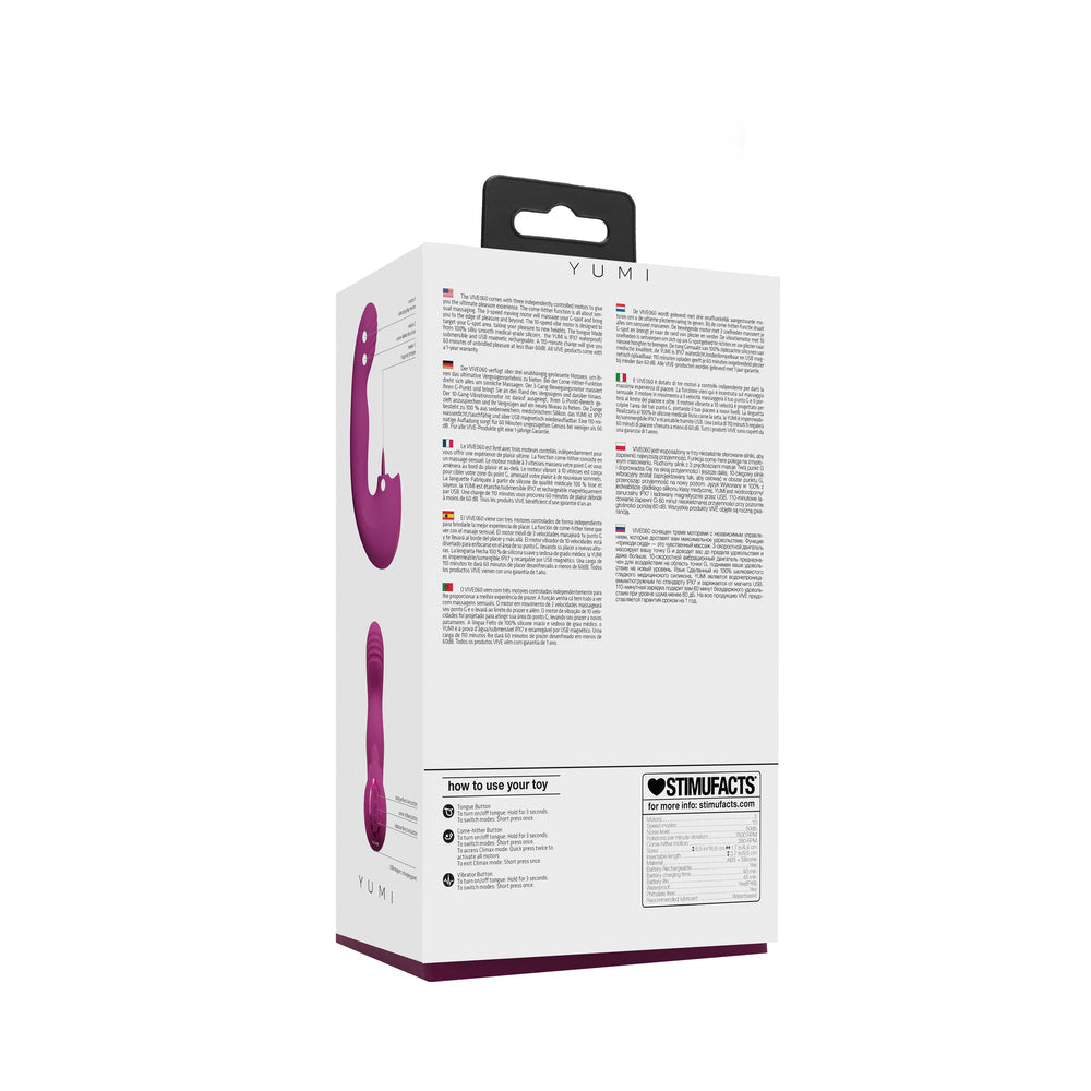 The VIVE YUMI comes with three independently controlled motors to give you the ultimate pleasure experience. The come-hither function is all about sensual massaging. The 3-speed moving motor will massage your G-spot and bring you to the edge of pleasure and beyond. The 10-speed vibe motor is designed to target your G-spot area, taking your pleasure to new heights. The tongue Made from 100% silky smooth medical-grade silicone, the YUMI is IPX7 waterproof/submersible and USB magnetic rechargeable. A 110-minute charge will give you 60 minutes of unbridled pleasure at less than 60dB. All VIVE products come with a 1-year warranty. Dimensions package: 5in. x 3.11in. x 8.86in. Weight package: 16.72 oz Product dimensions: 5.39in. x 1.73in. x 4.13in. Product weight: 5.54 oz Product diameter: 1.18in. Insertable length: 3.94in. Quantity motors: 2 Rotations per minute: 7500 RPM Rotations vibration tip: 7000 RPM Speed modes: 10 Multi speed: Yes Noise level: 60 dB Rechargeable: Yes Rechargeable time: 90 min Recharged battery lifetime: 45 min Waterproof: Yes Splashproof: Yes Phthalate free: Yes Materials: Silicone, ABS