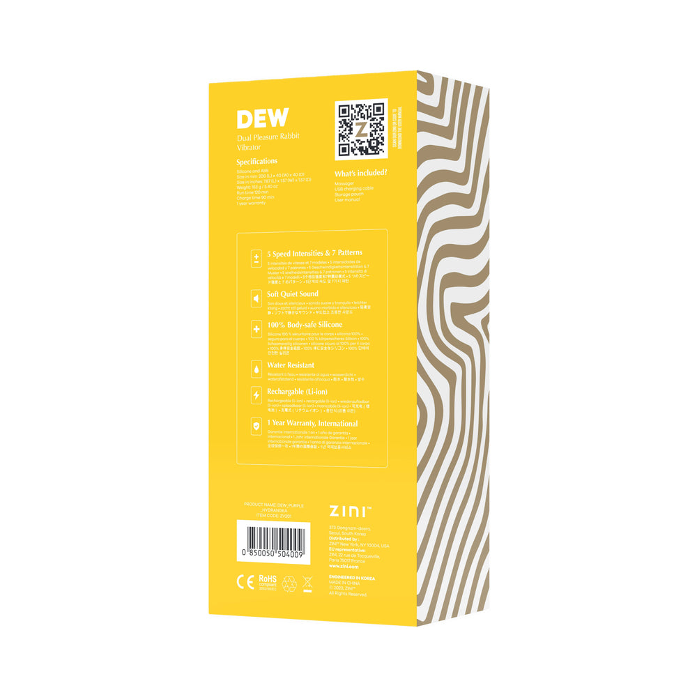 Say hello to Dew, the dual pleasure rabbit vibrator that caters to your deepest desires and accompanies you on a captivating sensual journey. Effortlessly merging internal and external stimulation, this modern vibrator creates a harmonious symphony of sensations.Made from 100% body-safe materials, Dew ensures a luxurious and discreet encounter. Unveil its 5 speed intensities and 7 patterns, allowing its irresistible allure to engage your senses with captivating vibrations. Enhanced by its water-resistant design, Dew invites exploration during shower or bath time, inviting you to fully immerse yourself in its enticing soft and sensual realm, embracing sensuality for an unforgettable array of encounters.Details Dual Pleasure G-Spot Vibrator 7 speed Intensities 10 Patterns Soft Quiet Sound 100% Body-Safe Silicone + ABS Water Resistant Rechargeable (Li-ion), USB Storage Pouch 1 Year Warranty Runtime: 120 min Charge time: 90 min Box contains: 1x Massager, 1x USB Magnetic Charging Cable, 1x Storage Pouch, 1x User Manual